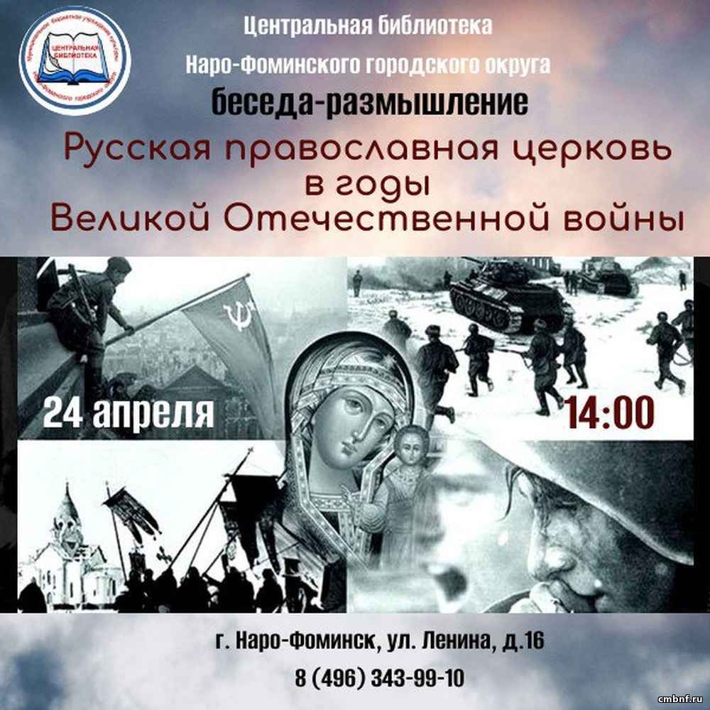 Клуб «Беседа» приглашаетПриглашаем вас на беседу-размышление на тему «Русская православная церковь в годы Великой Отечественной войны», которая состоится в клубе «Беседа». 24 апреля в 14:00 Клуб «Беседа», Центральная библиотека, ул. Ленина, д.16. Мы обсудим значимую роль Русской православной церкви в годы Великой Отечественной войны. Поговорим о том, как Церковь поддерживала верующих в трудные времена, помогала солдатам и населению, а также о духовных ценностях, которые играли важную роль в укреплении духа народа. Будем рады видеть вас на нашем мероприятии!