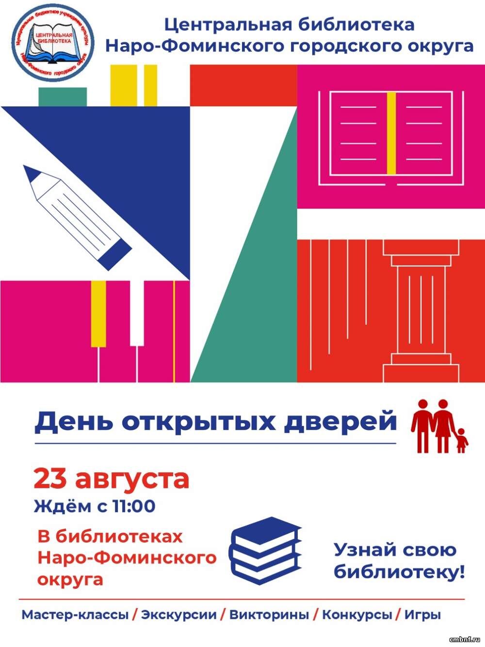 Уважаемые жители и гости Наро-Фоминского городского округа!Приглашаем вас на День открытых дверей в библиотеках, который состоится 23 августа. В этот день наши библиотеки откроют свои двери для всех желающих! Что вас ждет: - Экскурсии по библиотекам и знакомство с фондом. - Презентации новых книг. - Мастер-классы и лекции на актуальные темы. - Информирование о проводимых мероприятиях и клубах по интересам. - Возможность задать вопросы библиотекарям и получить советы по пользованию библиотечными ресурсами. Ждем вас на празднике книг и знаний!
