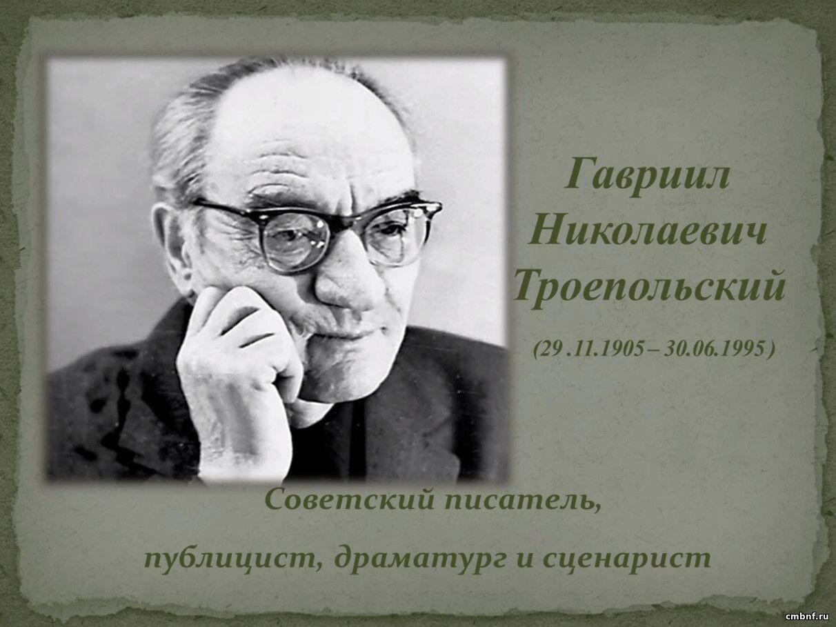 Творчество Гавриила ТроепольскогоОнлайн-рассказ о творчестве известного писателя Гавриила Троепольского представляет вашему вниманию библиотекарь Анна Берёза (библиотека по адресу ул. Полубоярова, 5).