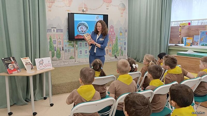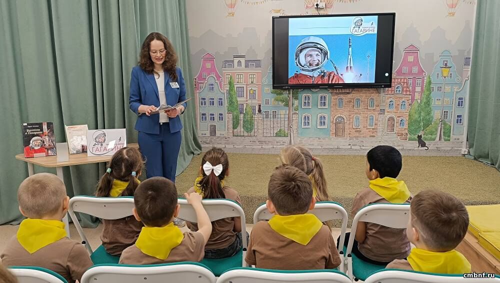 Ребята посмотрели видео о легендарном полете советского космонавта. Библиотекарь прочитала детям рассказы о Юрии Гагарине из книги Ю. Нагибина.