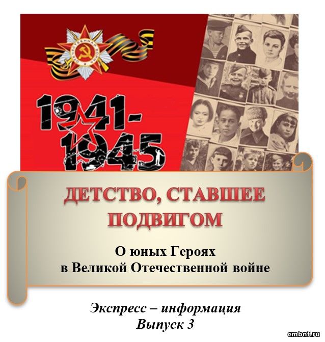Для юных читателей к Году защитника Отечества и к 80-летию Победы ведущим библиографом Центральной библиотеки И. А. Лукьяновой подготовлен третий выпуск экспресс – информации о подвигах юных героев Великой Отечественной войны.