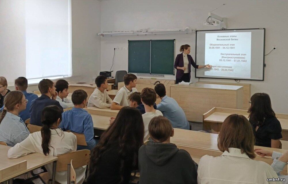 Библиотекарь отдела обслуживания читателей провела час краеведения для старшеклассников. Она рассказала о значении Московской битвы 1941–1942 годов, подчеркнув её ключевую роль в исходе Второй мировой войны.