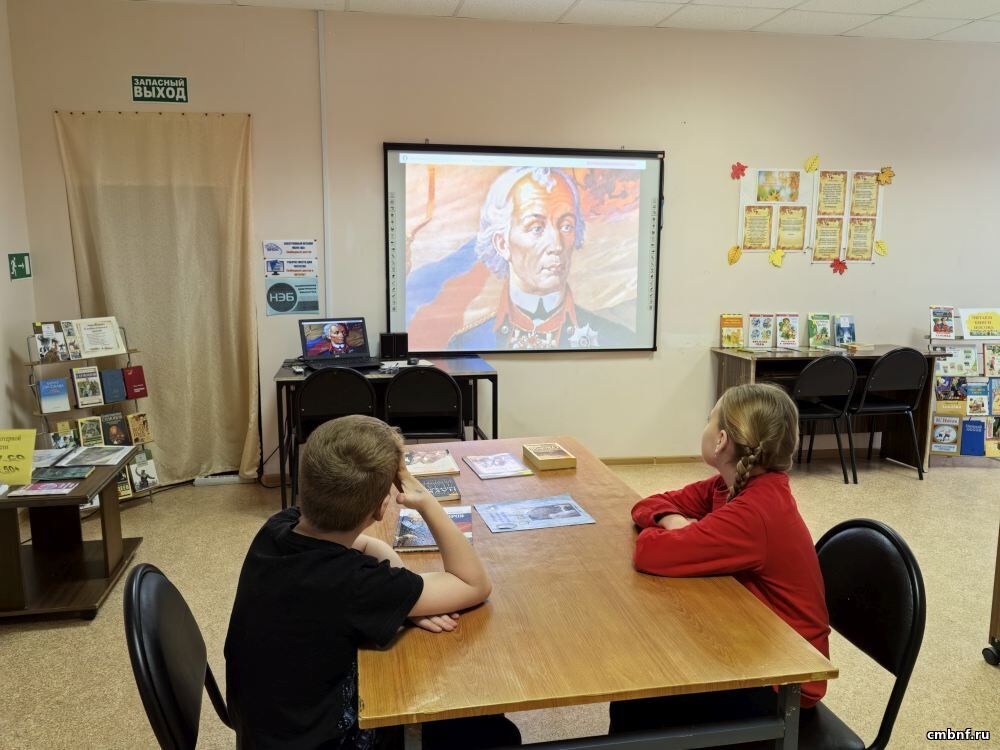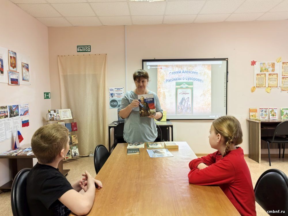 Библиотекарь познакомила детей с биографией полководца, рассказала об известных исторически важных событиях — взятии турецкой крепости Измаил и боевом походе легендарного полководца через Альпы, а также провела обзор книг о Суворове.