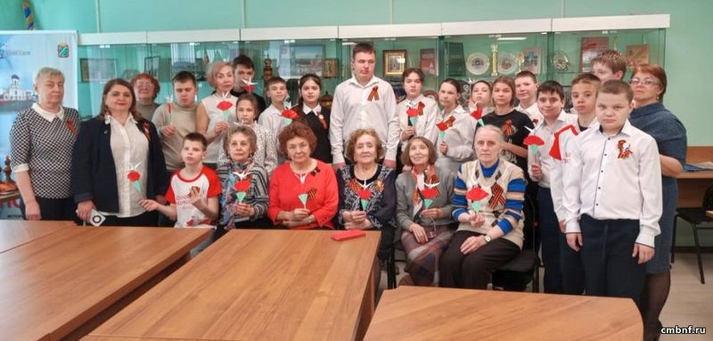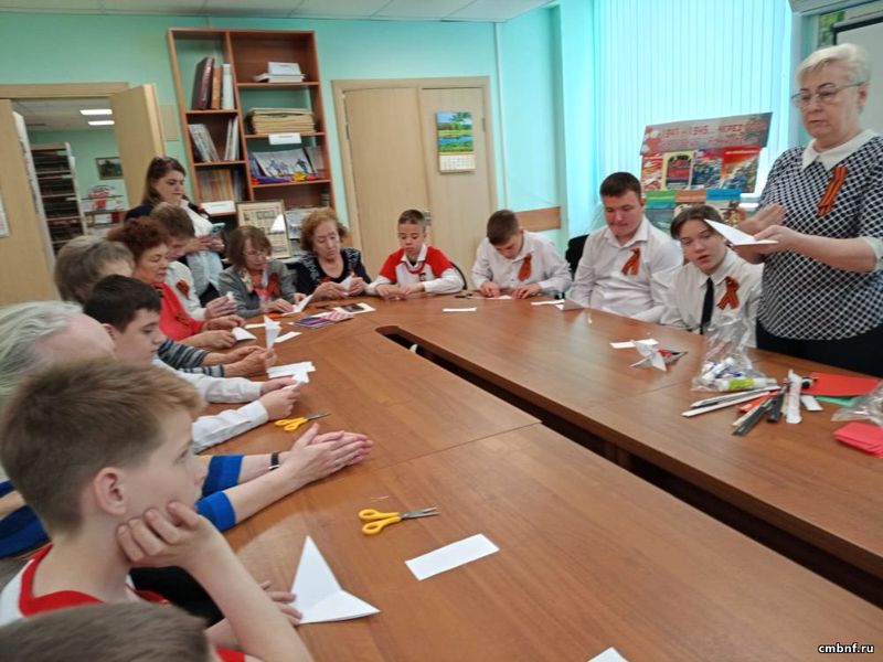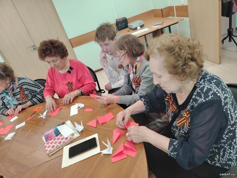 Юные волонтёры школы вручили Георгиевскую ленту представителям старшего поколения. Завершилось мероприятие мастер-классом по изготовлению журавликов.