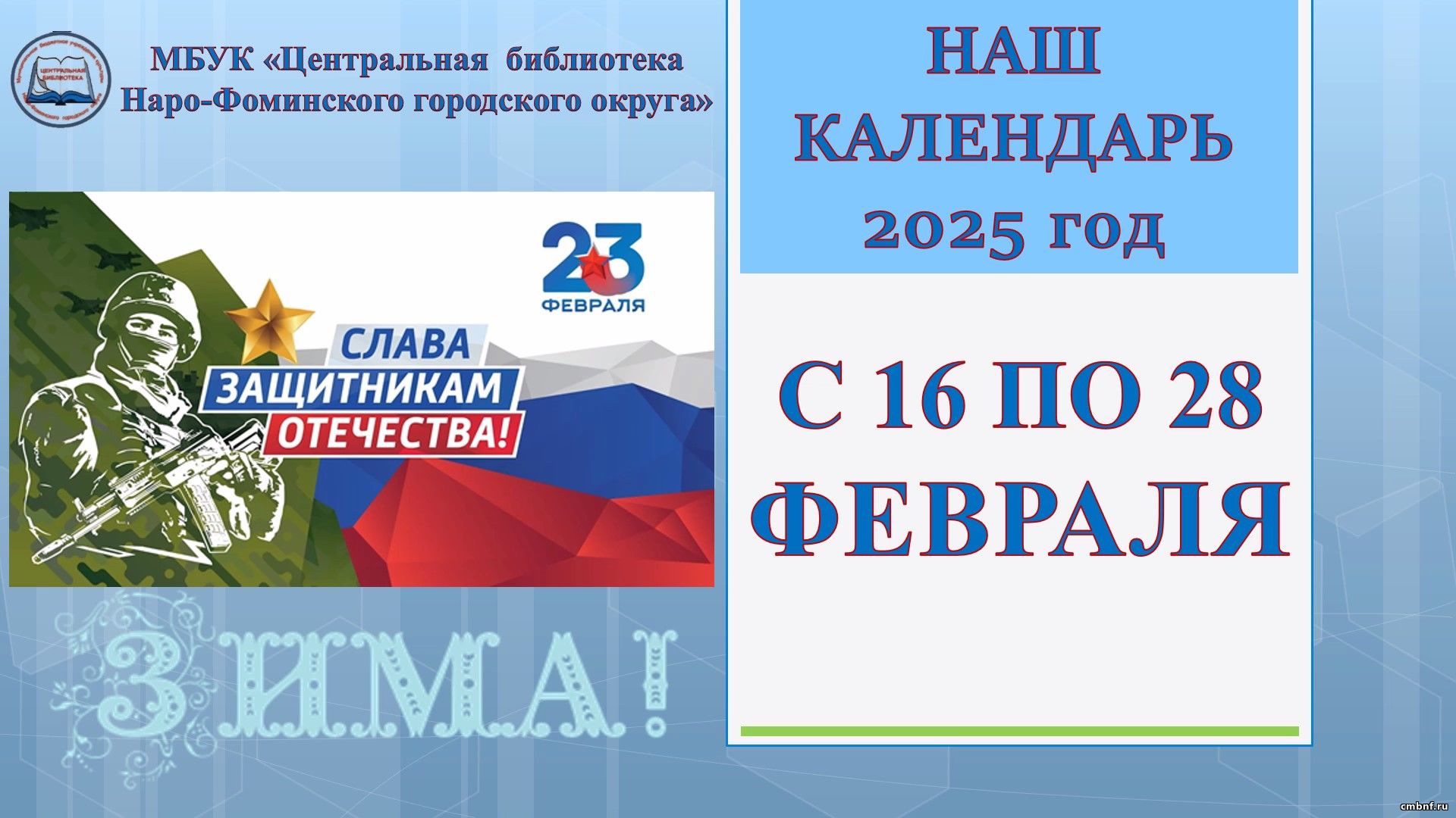 Представляем вашему вниманию «Наш календарь» знаменательных и памятных дат с 16 по 28 февраля 2025 года, подготовленный ведущим библиографом МБУК «ЦБ Наро-Фоминского городского округа» Ириной Лукьяновой.