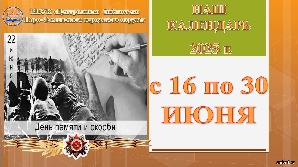 Представляем вашему вниманию «Наш календарь» знаменательных и памятных дат с 16 по 30 июня 2025 года, подготовленный ведущим библиографом МБУК «ЦБ Наро-Фоминского городского округа» Ириной Лукьяновой.