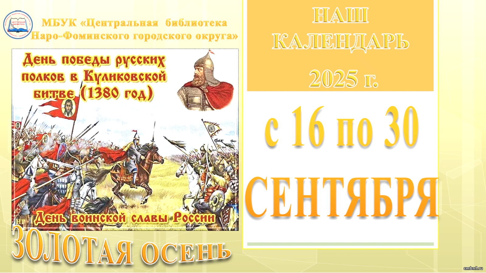 Представляем вашему вниманию «Наш календарь» знаменательных и памятных дат с 16 по 30 сентября 2025 года, подготовленный ведущим библиографом МБУК «ЦБ Наро-Фоминского городского округа» Ириной Лукьяновой.
