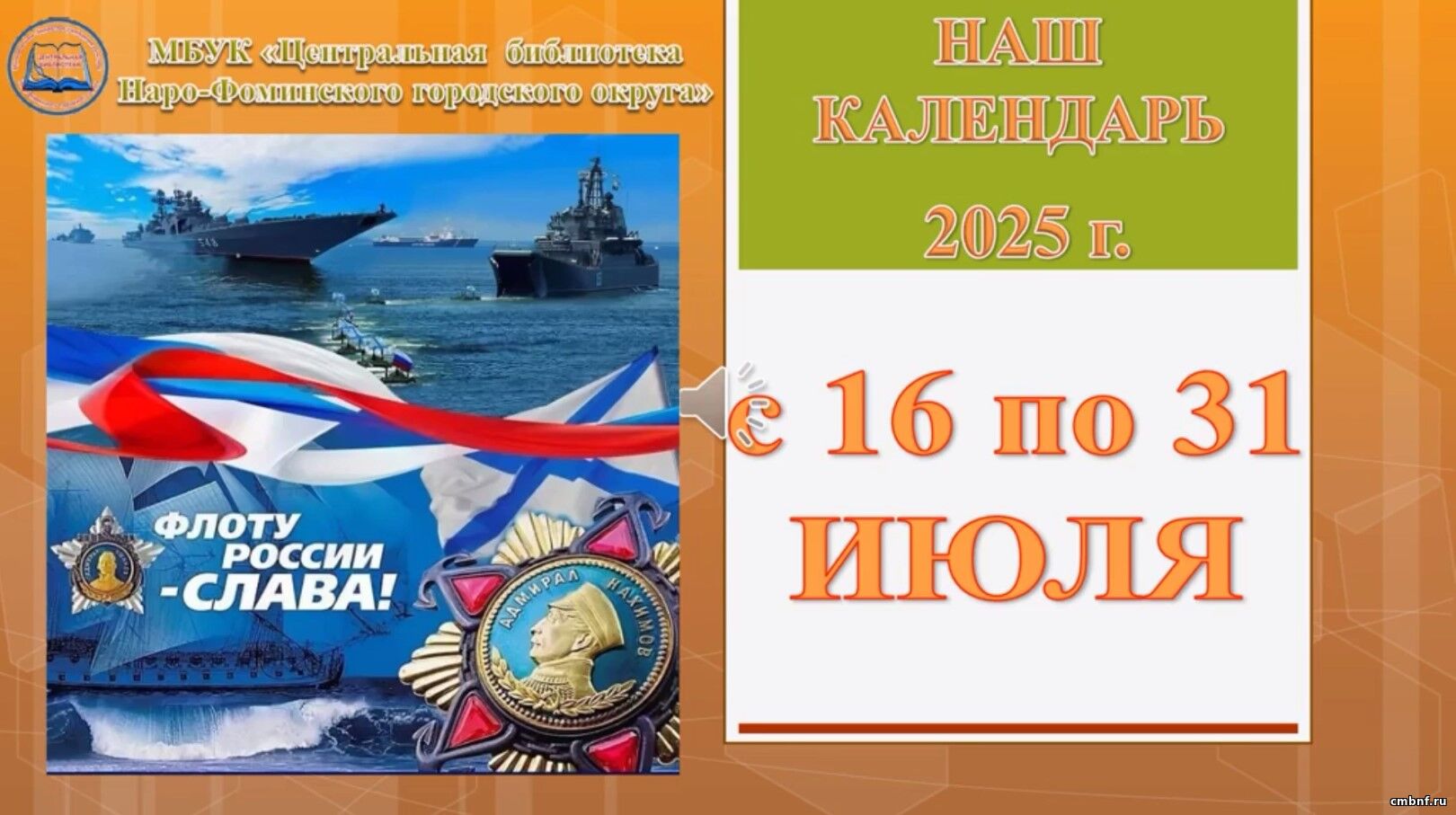 Представляем вашему вниманию «Наш календарь» знаменательных и памятных дат с 16 по 31 июля 2025 года, подготовленный ведущим библиографом МБУК «ЦБ Наро-Фоминского городского округа» Ириной Лукьяновой.