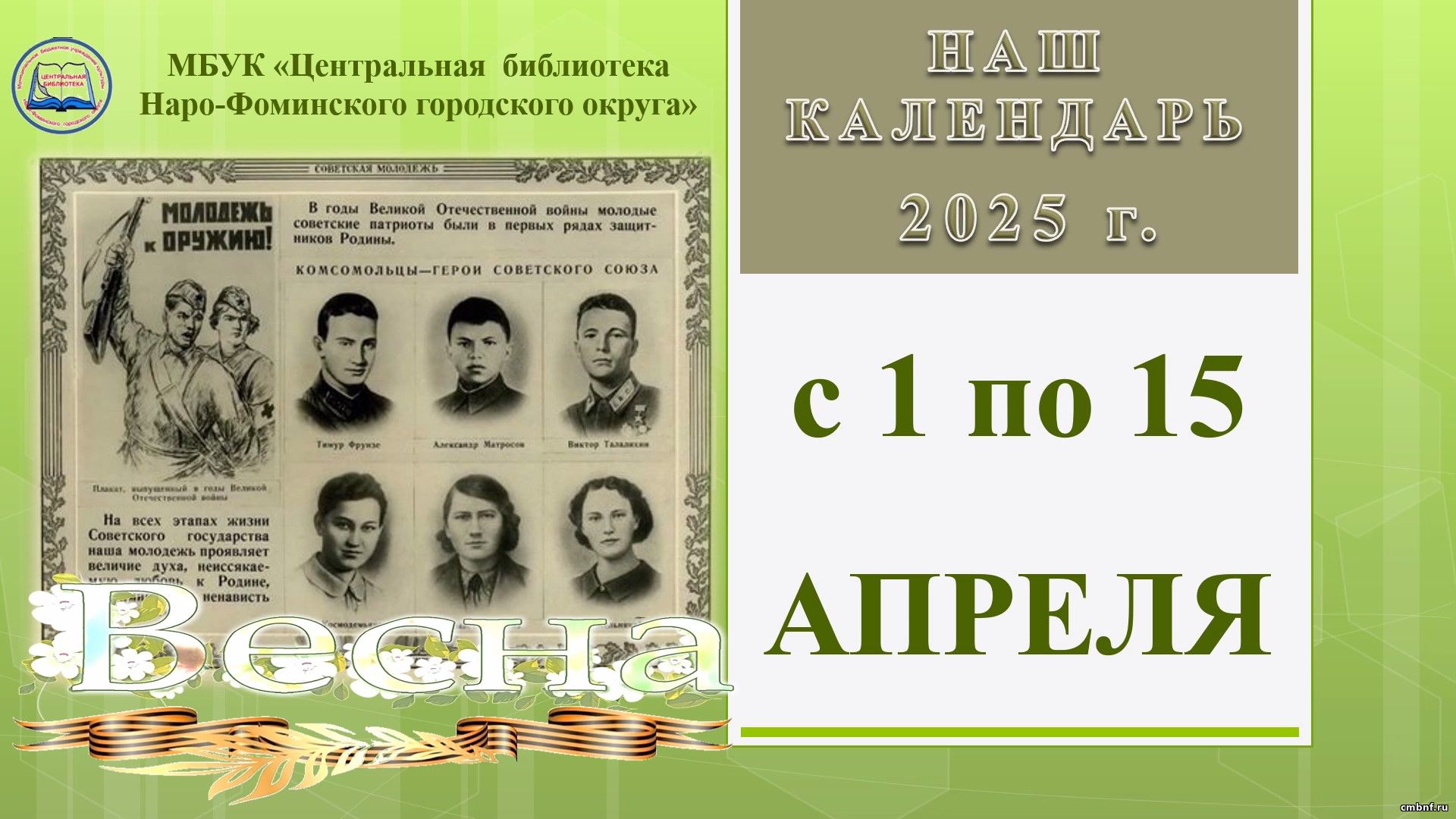Представляем вашему вниманию «Наш календарь» знаменательных и памятных дат с 1 по 15 апреля 2025 года, подготовленный ведущим библиографом МБУК «ЦБ Наро-Фоминского городского округа» Ириной Лукьяновой.