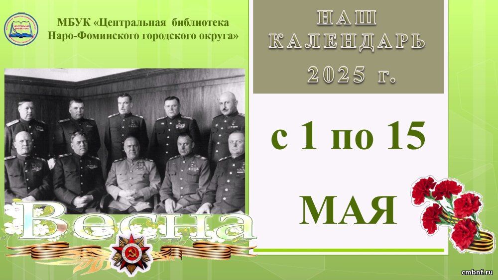 Представляем вашему вниманию «Наш календарь» знаменательных и памятных дат с 1 по 15 мая 2025 года, подготовленный ведущим библиографом МБУК «ЦБ Наро-Фоминского городского округа» Ириной Лукьяновой.