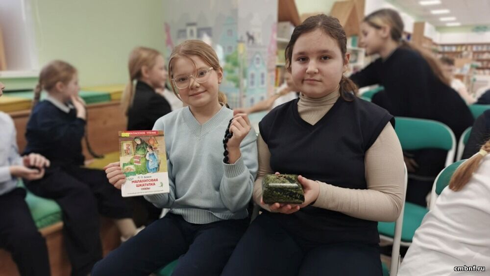 Библиотекарь рассказала ребятам о биографии писателя и его становлении как фольклориста. Особый интерес у аудитории вызвал рассказ о самоцветах Урала: дети рассматривали камни и вспоминали, в каких сказах те встречаются.