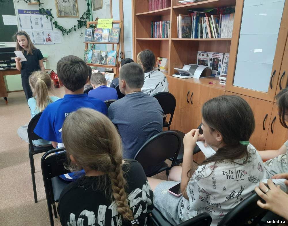 Любовь Николаевна рассказала ребятам о начале Великой Отечественной войны, о подвиге и о героизме защитников Родины. Вниманию участников мероприятия была представлена книжная выставка «В книжной памяти мгновения войны». Мероприятие завершилось викториной «Что я знаю о войне».