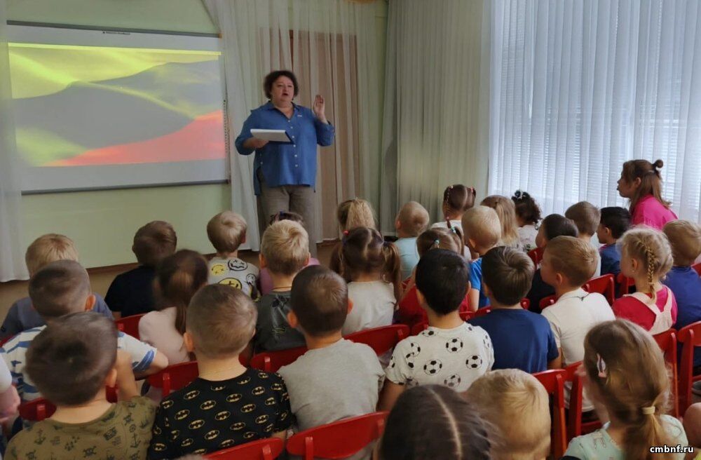 Сотрудники отдела обслуживания читателей пришли в детский сад № 5, чтобы провести информационный час «Триколор страны родной», приуроченный ко Дню Государственного флага Российской Федерации.