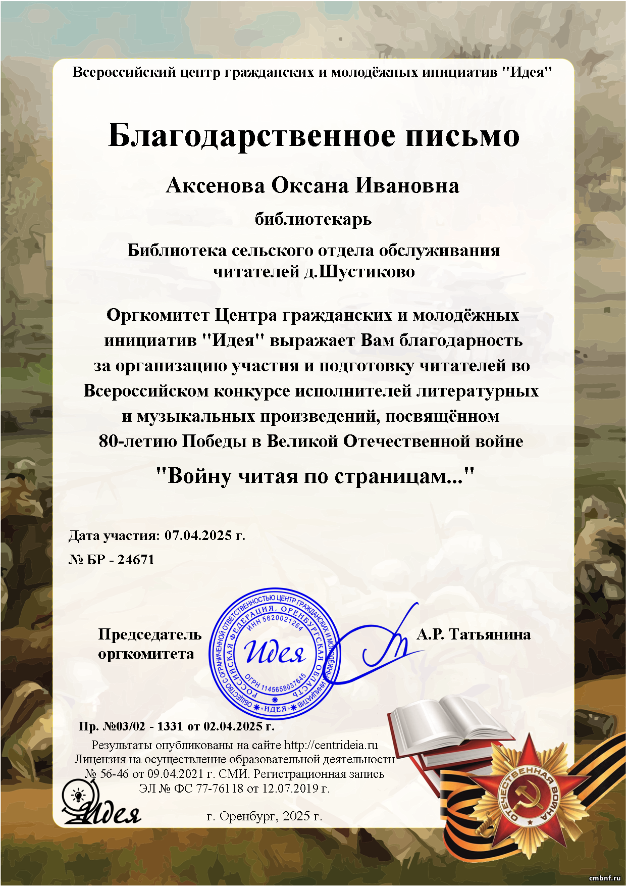 В честь самого светлого праздника, Дня Победы, библиотекарь Аксенова О.И. (д. Шустиково) подготовила детей для участия в дистанционном творческом конкурсе чтецов, подобрав стихи о Великой Отечественной войне, о людях, которые показывали образцы стойкости и умения побеждать, защищая свою Родину.