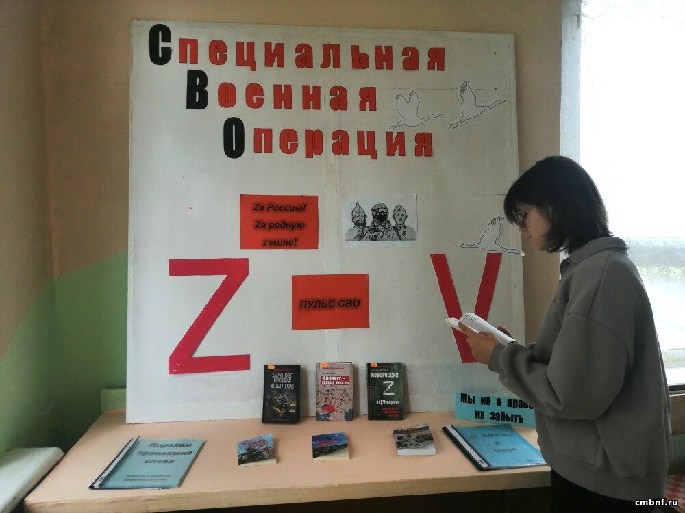 Библиотекарь рассказала о мужестве и героизме наших солдат во все времена, об их подвигах и любви к Родине, о причинах начала специальной военной операции на Украине. Присутствующие просмотрели хронику главных военных событий, состоялся обзор книжно-иллюстративного стенда «СВО: За Россию! За родную землю!» и выставки «Специальная военная операция».