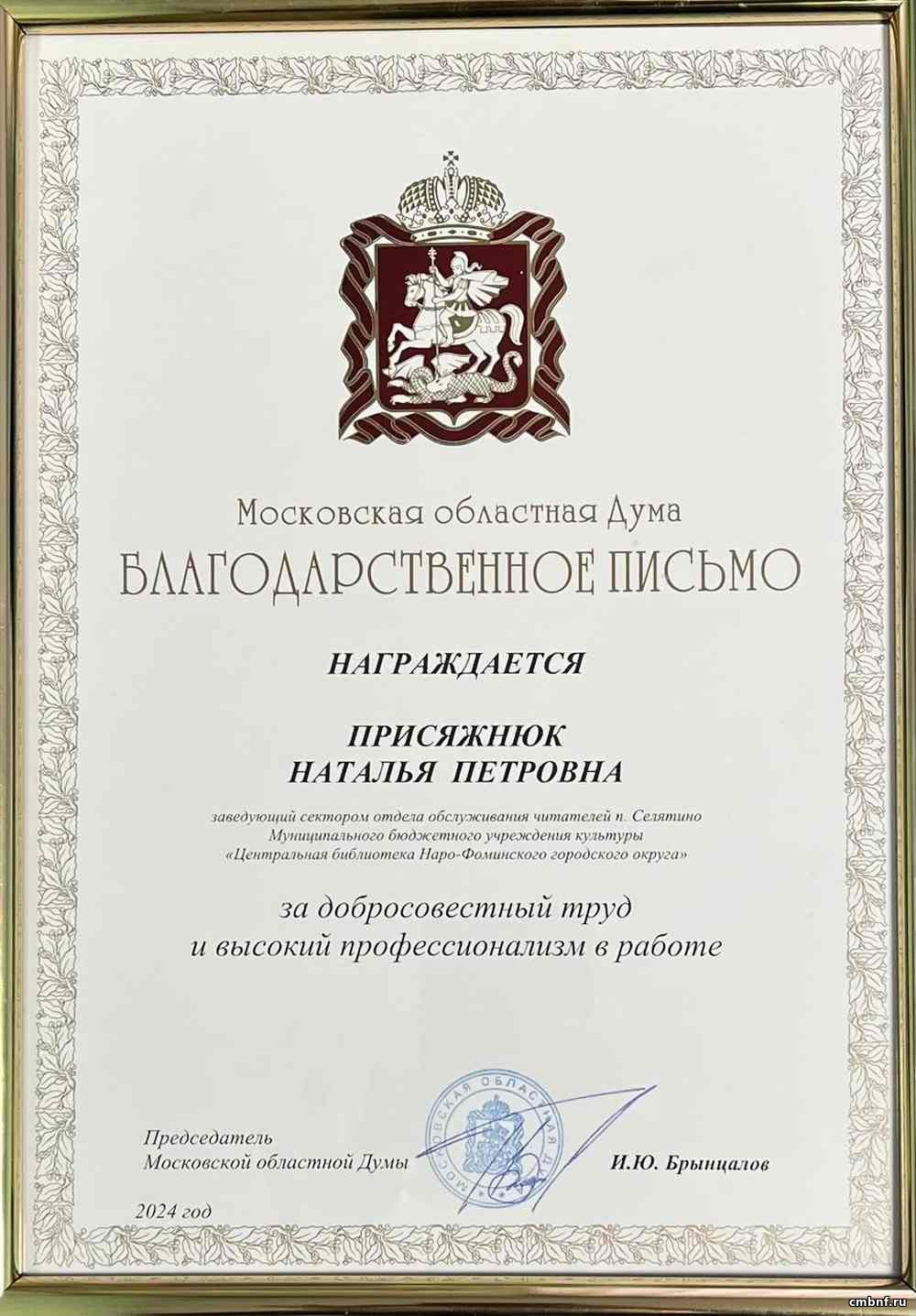6 февраля в Доме культуры «Мечта» состоялось торжественное мероприятие, на котором депутат Московской областной думы Александр Николаевич Баранов наградил заведующую сектором отдела обслуживания читателей посёлка Селятино Наталью Петровну Присяжнюк благодарственным письмом.