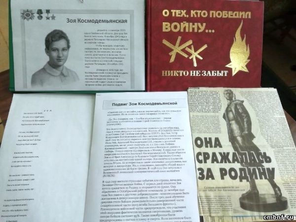 Подвиг Зои Космодемьянской13 сентября в сельском отделе обслуживания читателей в д. Устье прошла беседа по патриотическому воспитанию «Подвиг Зои Космодемьянской». Мероприятие началось стихотворением «Зоя» поэта Н. Дмитриева. Библиотекарь Сажина О.И. рассказала детям о жизни и героической судьбе Зои Космодемьянской.