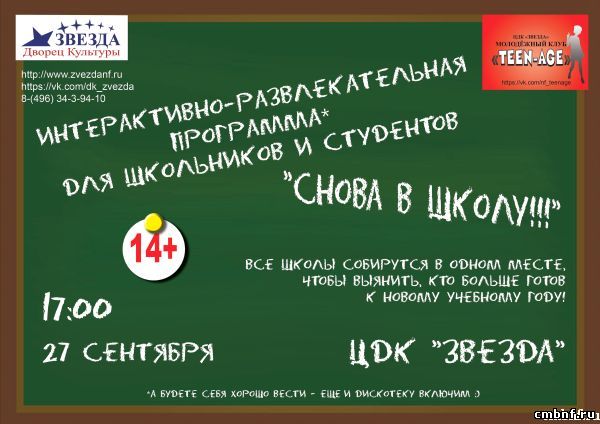 Праздничный вечер "Снова в школу"27 сентября в 17:00 молодёжный клуб "Teen-age" приглашает школьников от 14 лет в ЦДК "Звезда" на праздничный вечер, посвящённый новому учебному году. Вход бесплатный. К участию приглашаются команды по 10 человек. Остальные - зрители. Вас ожидает море веселья, общения, призы и подарки для победителей конкурсной программы!