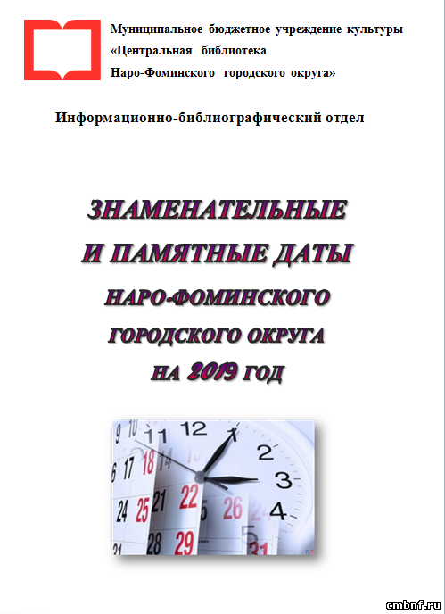 Знаменательные и памятные даты Наро-Фоминского городского округа на 2019 год1 января 2018 года вступил в силу Закон Московской области «О праздничных днях и памятных датах Московской области». Перечень праздничных дней и памятных дат, по которым Правительство Московской области предлагает муниципальным образованиям проводить мероприятия, расположен на первых страницах краеведческого календаря.