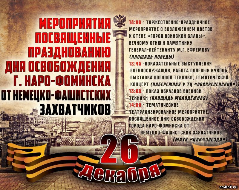 Мероприятия посвященные празднованию дня освобождения г. Наро-ФоминскаАфиша мероприятий посвященных празднованию дня освобождения г. Наро-Фоминска от немецко-фашистских захватчиков.