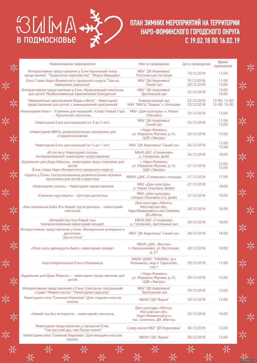 «Зима в Подмосковье» Перечень мероприятий Наро-Фоминского городского округа, запланированных к проведению в рамках проекта Губернатора Московской области А.Ю. Воробьева «Зима в Подмосковье»