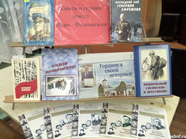 Книги о героях земли Наро-фоминскойВ декабре заседание литературного кружка «Юный читатель» проходило в помещении средней школы № 7. Темой встречи стали книги, посвящённые героям земли Наро-фоминской. Библиотекари, используя слайд-презентацию «Читаем о героях», созданную сотрудниками информационно-библиографического отдела, рассказали учащимся школы о Маршале Г.К. Жукове и генерале М.Г. Ефремове, о подвигах тех, кто защищал нашу малую родину. Дети с интересом рассматривали материалы книжной выставки.