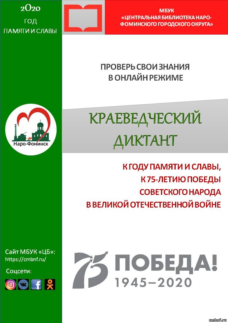 ПРИГЛАШАЕМ ПРИНЯТЬ УЧАСТИЕ В КРАЕВЕДЧЕСКОМ ДИКТАНТЕДень Победы – один из самых почитаемых праздников нашего народа. И чем дальше от нас май сорок пятого года, тем отчётливее проступает значение этого дня и величие подвига того поколения. Тем важнее сохранить и передать память о той войне нашим потомкам. А Вы хорошо знаете военную историю наро-фоминской земли? К 75-летию Победы в Великой Отечественной войне Центральная библиотека подготовила «Краеведческий диктант». Проверьте себя, ответив на вопросы.