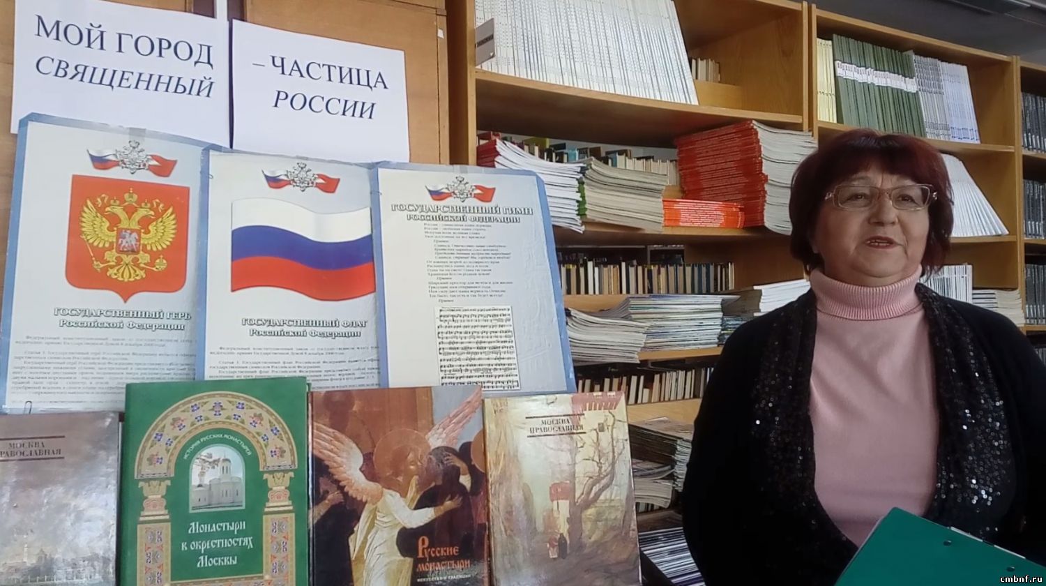 «Мой город священный - частица России»Велика, красива и богата Россия - наша любимая Родина! Торжественны и величавы её символы: Гимн, Герб, Флаг! Но у каждого есть ещё и малая родина - там, где ты родился и вырос. Библиотекарь отдела обслуживания читателей Светлана Ревина в беседе «Мой город священный - частица России» расскажет ещё об одном символе России - о символе духовности и нравственности нашего народа, о храмах Наро-Фоминска, чья история неразрывно связана с историей страны.