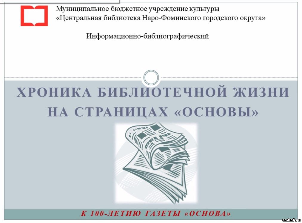«Хроника библиотечной жизни на страницах «Основы»В 2020 году исполняется 100 лет газете «Основа». Многие годы Центральная библиотека Наро-Фоминского городского округа сотрудничает с изданием. На его страницах можно проследить всю историю библиотеки. Читатели узнают из публикаций о проводимых мероприятиях, конкурсах и викторинах, истории родного края, об инновационных возможностях, а также знакомятся с нашими изданиями. К юбилею газеты библиографом информационно-библиографического отдела Лукьяновой И.А. подготовлена виртуальная выставка «Хроника библиотечной жизни на страницах «Основы».