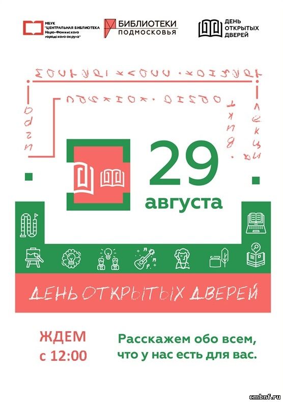 День открытых дверейЕдиный ДЕНЬ ОТКРЫТЫХ ДВЕРЕЙ в библиотеках Лучший способ всё узнать о библиотеке – это заглянуть в нее 29 августа. В последнюю субботу лета библиотеки всех муниципалитетов региона проведут единый День открытых дверей. С 12:00 в них будут рассказывать и показывать все то, что делает библиотеку современным центром знаний, общения, интеллектуального досуга и саморазвития. Знакомство с фондами, издательскими новинками и «бестселлерами» - самая малая часть того, что ждет посетителей в Центральной библиотеке Наро-Фоминского городского округа. Библиотекари готовят программу, которая продемонстрирует возможности библиотеки как места для встреч, работы, учебы, творчества. Они познакомят жителей и гостей округа с действующими клубами и кружками, помогут сориентироваться в системном расписании и подобрать накануне учебного года интересующие занятия для малышей и их родителей, школьников, студентов, пенсионеров.