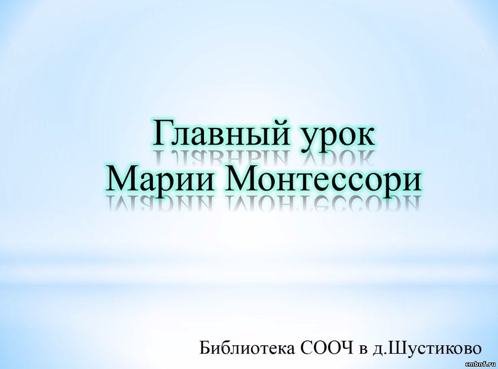 Главный урок Марии МонтессориМария Монтессори стоит в одном ряду с такими известными педагогами как Антон Макаренко, Георг Кершенштейнер, Джон Дьюи. Библиотека в д.Шустиково представляет онлайн-презентацию «Главный урок Марии Монтессори», где будет рассказано о судьбе этой невероятной женщины, ее вкладе в мировую педагогику, о плюсах и минусах методики Марии Монтессори.