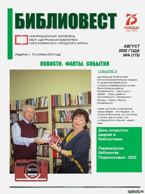 Информационный бюллетень «БИБЛИОВЕСТ» №4.Составлен и выпущен очередной информационный бюллетень БИБЛИОВЕСТ №4 На первой странице издания - об интересном событии в жизни библиотеки. 29 августа в Московской области прошёл единый День открытых дверей для всех учреждений культуры. Об участии Центральной библиотеки в данном мероприятии говорится на второй странице бюллетеня. Тема третьей страницы – «Перезагрузка библиотек Подмосковья», освещающая новый этап «Перезагрузки – 2020», образовательную программу и сроки проведения проекта, в котором участвует МБУК «ЦБ». Четвёртая страница издания – информационная. На ней представлены сведения о библиотеке: адрес, режим работы, контакты.