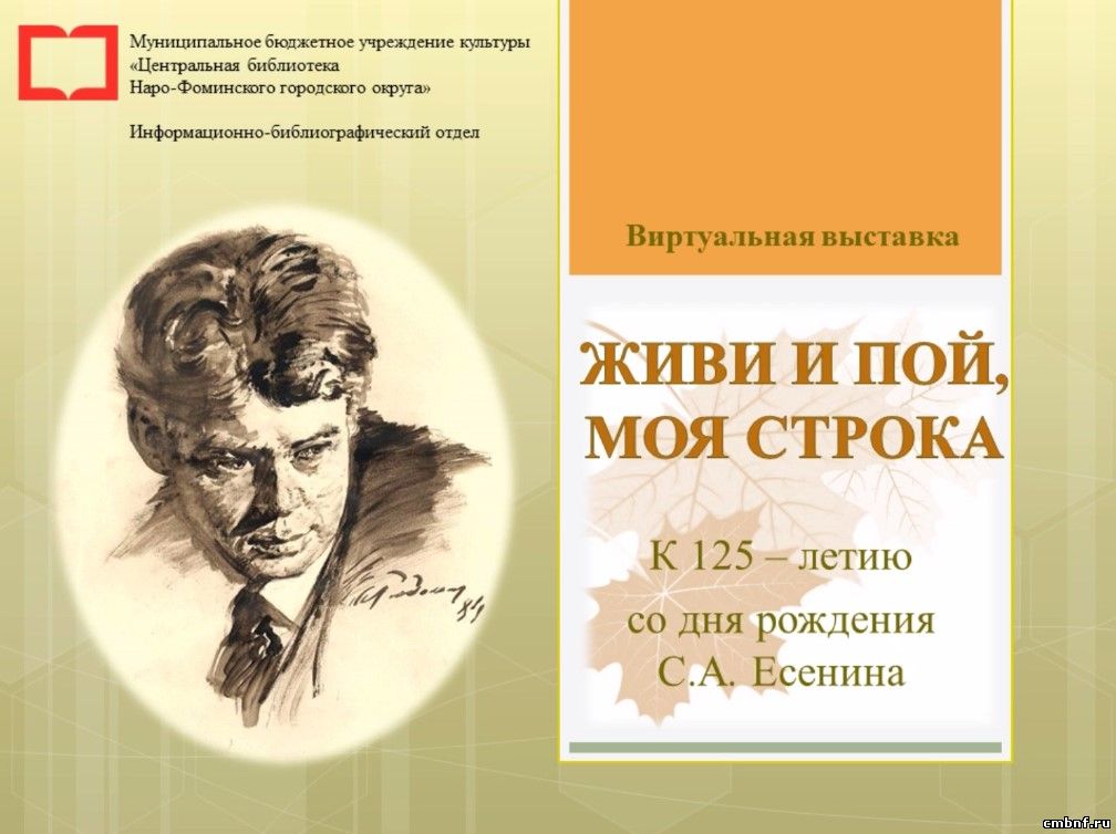 «Живи и пой, моя строка».Информационно-библиографическим отделом Центральной библиотеки Наро-Фоминского городского округа к 125 – летию со дня рождения народного поэта России Сергея Есенина, который отмечается 3 октября 2020 года, подготовлена виртуальная выставка «Живи и пой, моя строка». Вниманию читателей представлены книги о жизни и творчестве поэта, его произведения, а также издания, выпущенные информационно-библиографическим отделом к юбилею Сергея Есенина.