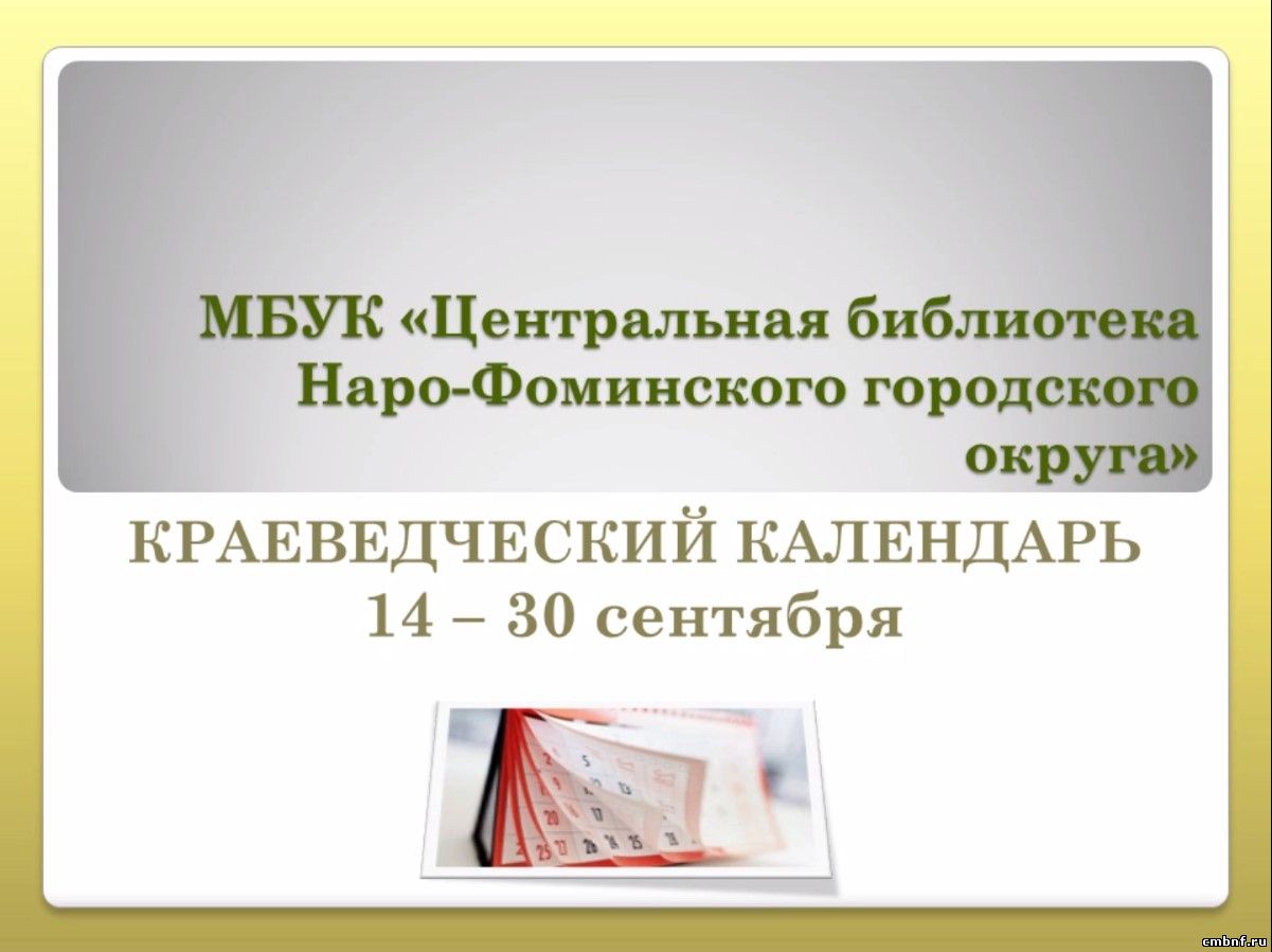 КРАЕВЕДЧЕСКИЙ КАЛЕНДАРЬ НА 14 – 30 СЕНТЯБРЯИнформационно-библиографический отдел Центральной библиотеки предлагает очередной видеообзор по знаменательным и памятным датам Наро-Фоминского городского округа. Открывает календарь стихотворение нашего земляка Бориса Алексеевича Кириллина «Осень. Сжигаю ботву…».