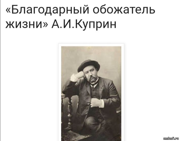 «Благодарный обожатель жизни»8 сентября в библиотеке д.Благовещенье прошел литературный час по творчеству А. Куприна «Благодарный обожатель жизни». Ребята совершили литературное путешествие по биографии писателя, стали свидетелями самых знаменательных событий в его жизни. В ходе рассказа дети узнали, что помимо литературного дара Куприн обладал необыкновенно широкой, доброй, отзывчивой натурой.