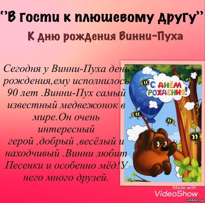"В гости к плюшевому другу"10 сентября в библиотеке д Благовещение дети собрались на день рождения Винни Пуха под названием "В гости к плюшевому другу". В начале ребята познакомились с биографией писателя Алана Милна, с историей создания плюшевого медвежонка. Сын писателя Кристофер Робин назвал его Винни Пухом. Ребята приняли участие в викторине, а завершился праздник показом мультфильма.