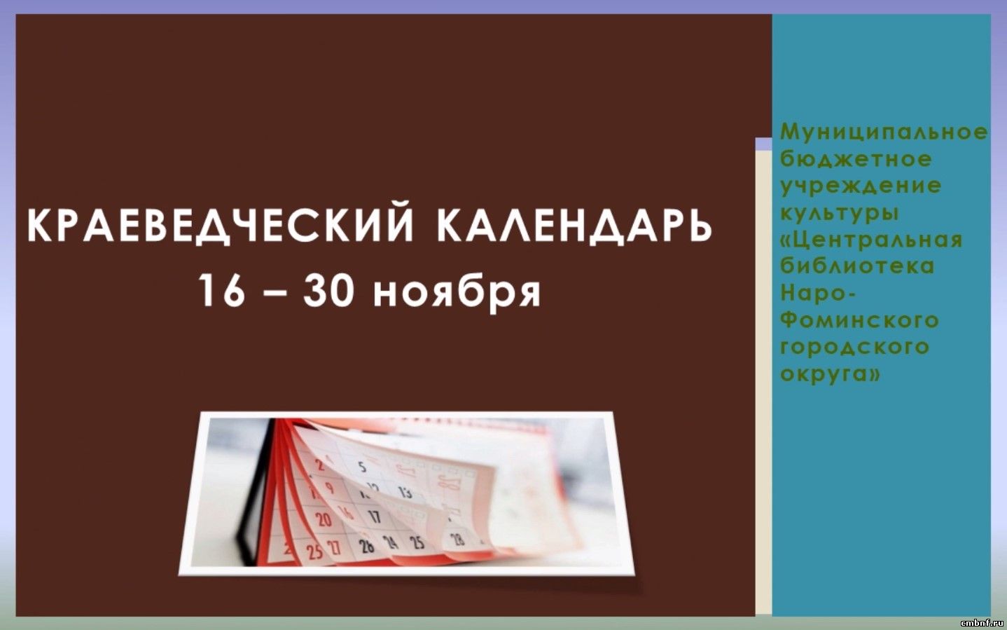 КРАЕВЕДЧЕСКИЙ КАЛЕНДАРЬ НА 16 – 30 НОЯБРЯВидеообзор на вторую половину ноября по материалам календаря «Знаменательные и памятные даты Наро-Фоминского городского округа на 2020 год». На поэтической страничке – стихотворение Л.Н. Синайко «У всех дорог – один итог…».