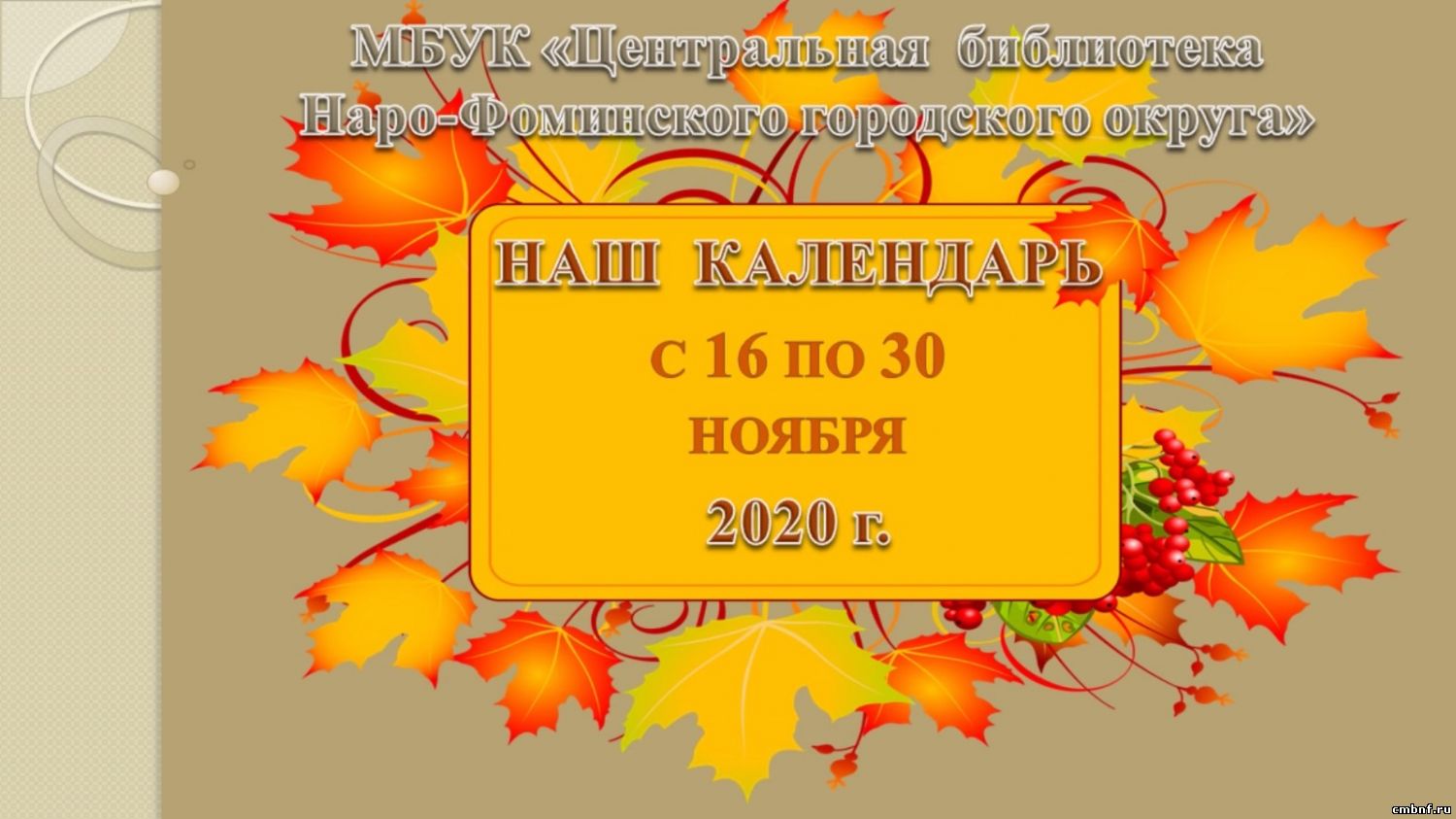 НАШ КАЛЕНДАРЬ с 16 по 30 НОЯБРЯПредставляем вашему вниманию календарь знаменательных и памятных дат с 16 по 30 ноября, подготовленный Лукьяновой И.А. - библиографом информационно-библиографического отдела.