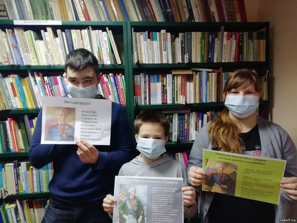 Тяжело в учении - легко в бою20 ноября библиотекарь Вера Семакина (с.Каменское) в рамках клуба по интересам «Знайка» провела литературную программу «Тяжело в учении - легко в бою», посвященную 285-летию со дня рождения полководца Александра Васильевича Суворова.