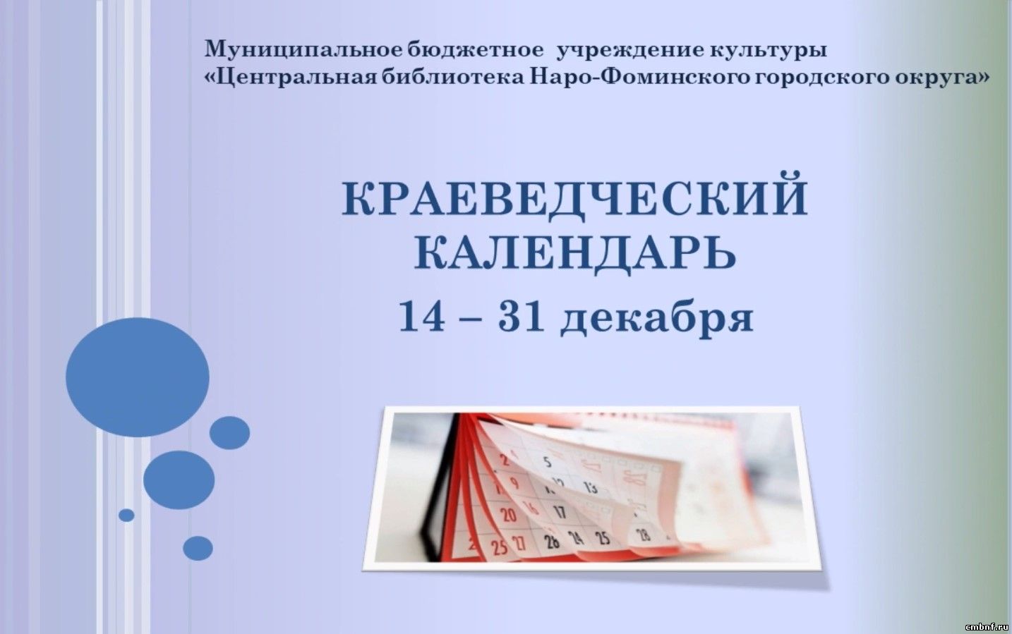 КРАЕВЕДЧЕСКИЙ КАЛЕНДАРЬ НА 14 –31 ДЕКАБРЯВидеообзор на вторую половину декабря по материалам календаря «Знаменательные и памятные даты Наро-Фоминского городского округа на 2020 год». На поэтической страничке – стихотворение Б. Кириллина «Утешает простое…».