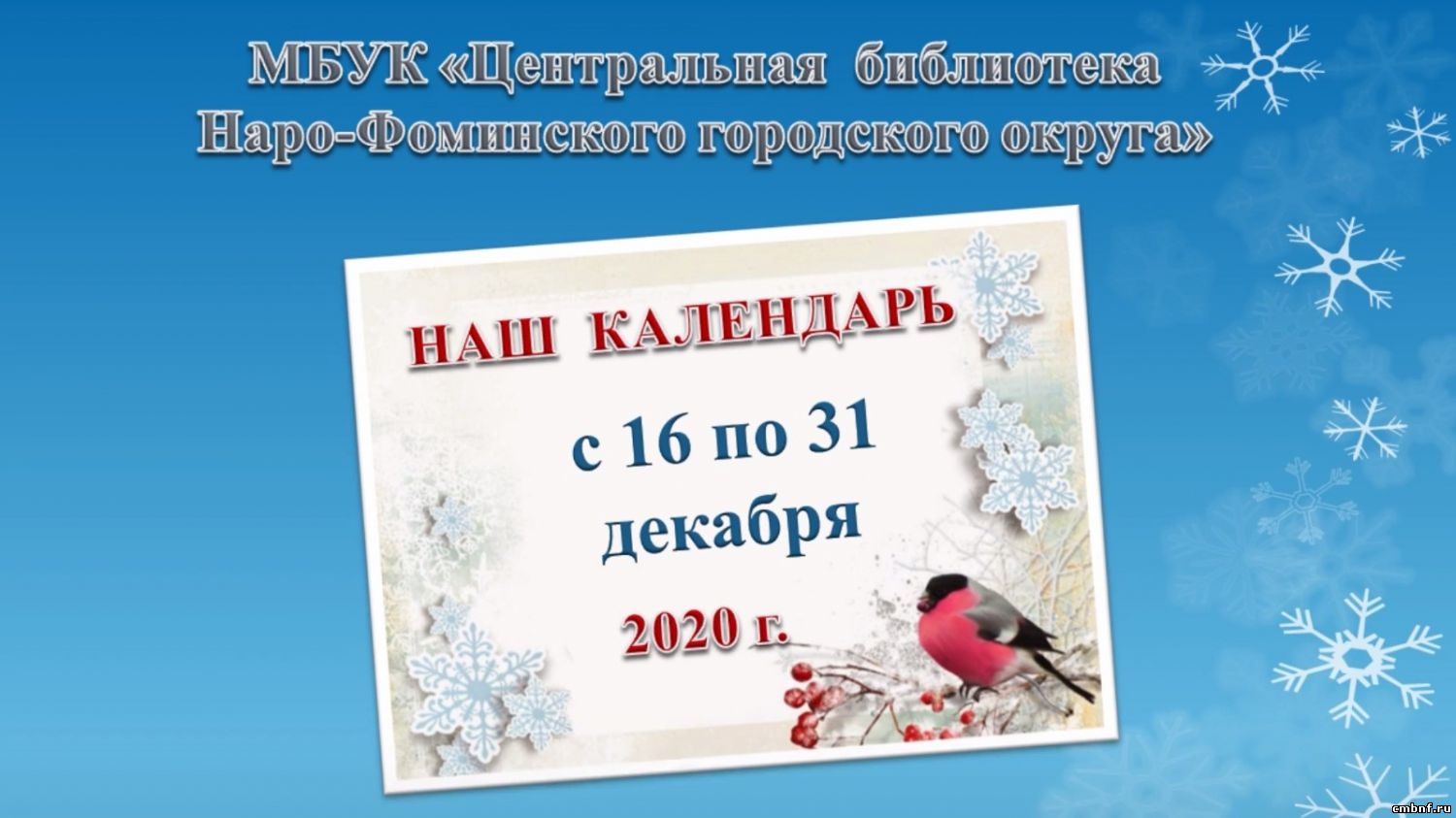 НАШ КАЛЕНДАРЬ с 16 по 31 декабряПредставляем вашему вниманию «Наш календарь» знаменательных и памятных дат с 16 по 31 декабря, подготовленный Лукьяновой И.А. - библиографом информационно-библиографического отдела.