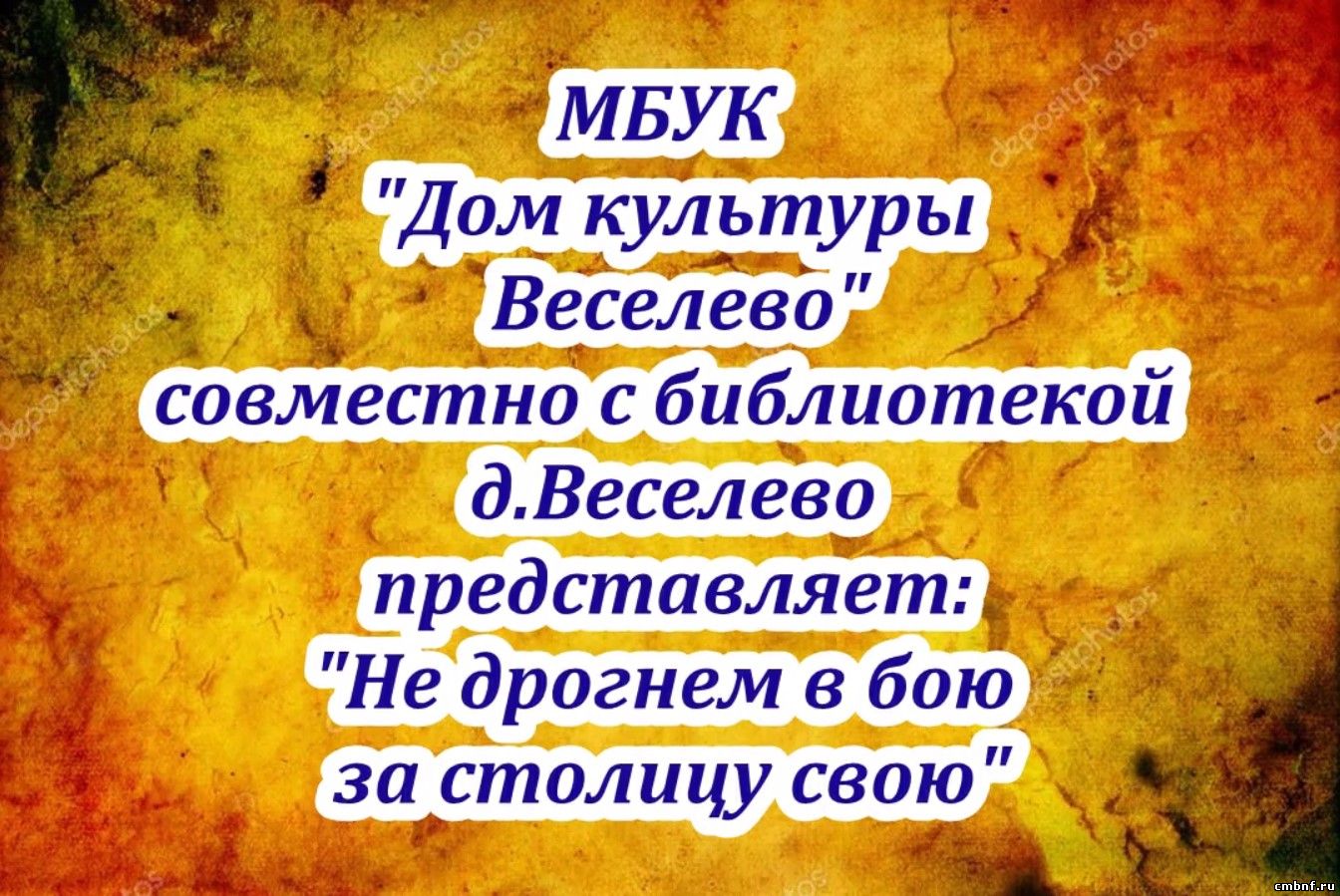 «Не дрогнем в бою за столицу свою!»Ко дню освобождения Наро–Фоминска от немецко–фашистских захватчиков сотрудники библиотеки в д.Веселево и Дома культуры «Веселево» подготовили мероприятие «Не дрогнем в бою за столицу свою!», где рассказали о знаменательной дате – дне освобождения Наро–Фоминска и о генерале М. Г. Ефремове, под руководством которого войсках 33 Армии освободили наш город.