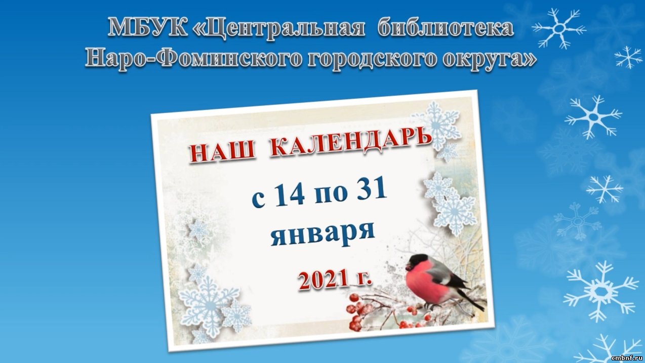 НАШ КАЛЕНДАРЬ с 14 по 31 январяПредставляем вашему вниманию «Наш календарь» знаменательных и памятных дат с 14 по 31 января, подготовленный Лукьяновой И.А. - библиографом информационно-библиографического отдела.