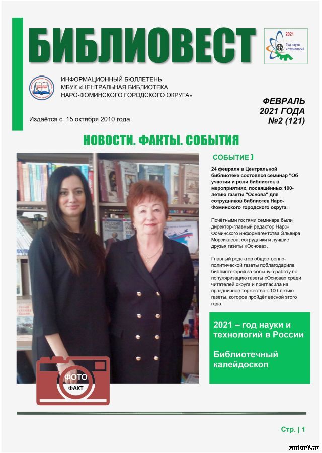 «БИБЛИОВЕСТ» № 2 (121)Информационно-библиографическим отделом составлен и выпущен очередной информационный бюллетень о библиотечной жизни БИБЛИОВЕСТ №2(121)