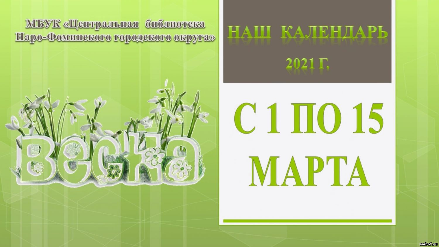НАШ КАЛЕНДАРЬ с 1 по 15 мартаПредставляем вашему вниманию «Наш календарь» знаменательных и памятных дат с 1 по 15 марта, подготовленный Лукьяновой И.А. - библиографом информационно-библиографического отдела.