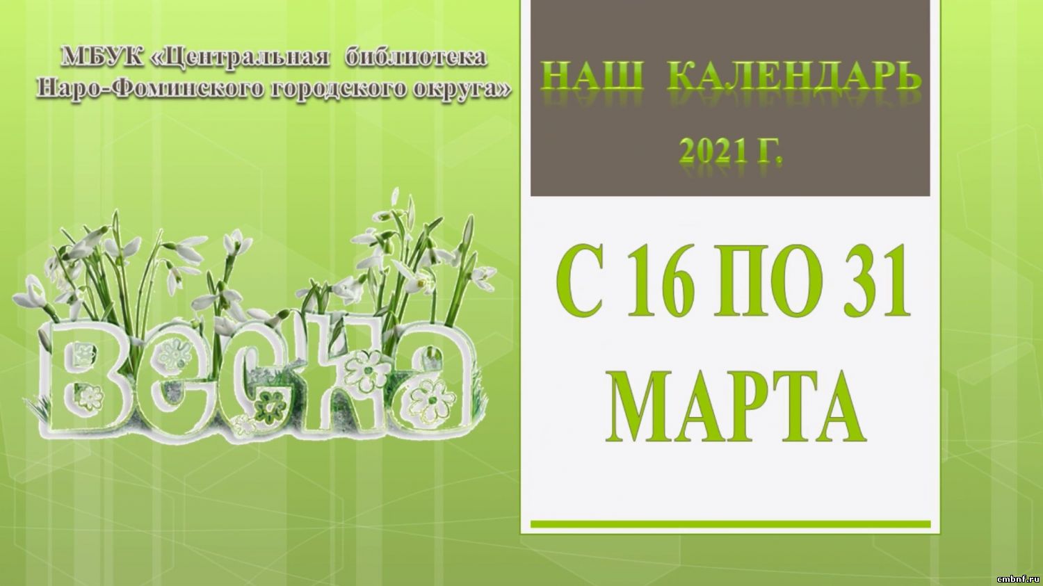 НАШ КАЛЕНДАРЬ с 16 по 31 мартаПредставляем вашему вниманию «Наш календарь» знаменательных и памятных дат с 16 по 31 марта, подготовленный Лукьяновой И.А. - библиографом информационно-библиографического отдела.