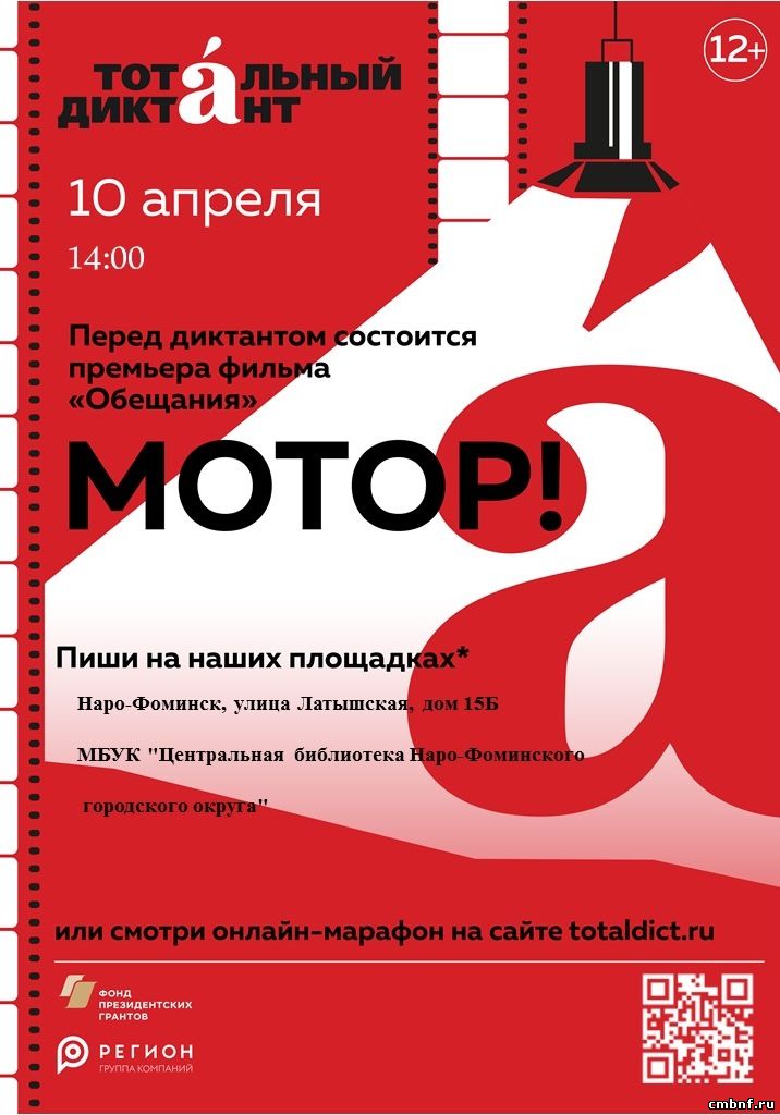 Тотальный диктант 2021Дорогие друзья! 10 апреля 2021 года объявляется днем Тотального диктанта — 2021. Тотальный диктант — это праздник всех, кто любит русский язык, кто хочет на нем грамотно говорить и писать. Приглашаем всех желающих принять участие в Тотальном диктанте, который состоится 10 апреля (суббота) в 14:00. Наша площадка расположена: г. Наро-Фоминск, ул. Латышская, д. 15Б, МБУК "Центральная библиотека Наро-Фоминского городского округа". Для участия в акции необходима предварительная регистрация на сайте Тотального диктанта https://totaldict.ru/, которая доступна с 31 марта 2021 года. Чтобы зарегистрироваться, вам нужно будет зайти на страницу нашего города, выбрать площадку, нажать кнопку «Зарегистрироваться» и следовать инструкциям. Спешите! Число мест ограниченно!