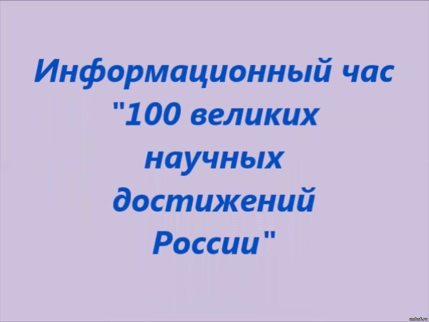 100 великих научных достижений РоссииПрезентацию, посвященную Году науки и технологий, представляет библиотекарь с.Атепецво Лариса Дмитриева.