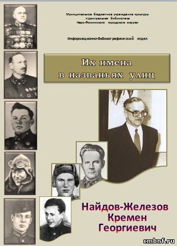 Издание «Найдов-Железов Кремен Георгиевич».В рамках проекта «Героев помним имена» в серии «Их имена в названьях улиц» информационно-библиографическим отделом подготовлено и выпущено издание «Найдов-Железов Кремен Георгиевич». Кремен Георгиевич – участник обороны Наро-Фоминска, брат-близнец Огняна Найдова-Железова, погибшего в октябре 41-го при обороне Наро-Фоминска (памятник ему установлен при въезде в город). Кремен Георгиевич – один из создателей Наро-Фоминского музея и Почётный гражданин города Наро-Фоминска. В год 40-летия Победы его имя было присвоено одной из улиц города. Издание, приуроченное к 100-летию со дня рождения О.Г. и К.Г. Найдовых-Железовых, включает информацию о переименовании улицы и присвоении Кремену Георгиевичу звания Почётный гражданин города Наро-Фоминска; статьи из газеты «Знамя Ильича», материалы о награждении с сайта «Память народа».