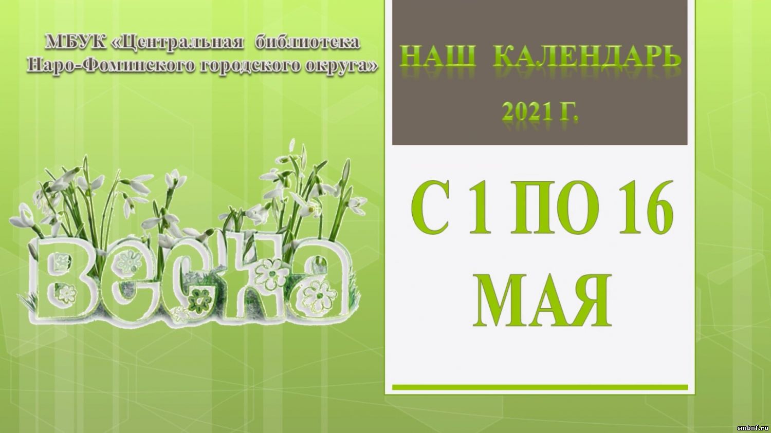 НАШ КАЛЕНДАРЬ с 1 по 16 маяПредставляем вашему вниманию «Наш календарь» знаменательных и памятных дат с 1 по 16 мая, подготовленный Лукьяновой И.А. - библиографом информационно-библиографического отдела.